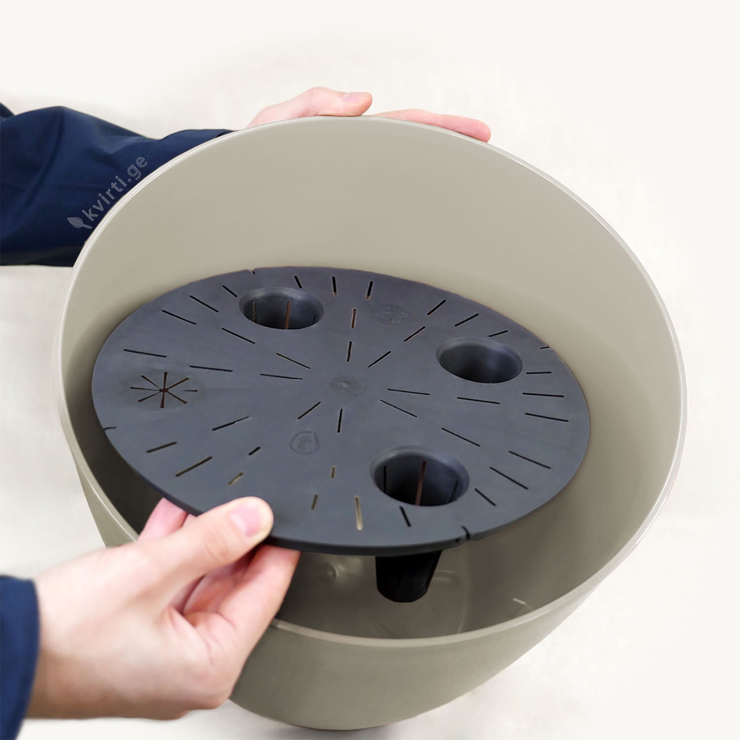 The pot includes an integrated water-reserve system to keep plants hydrated, and at the base a leaf-shaped stopper allows you to open or close the drainage hole when needed.