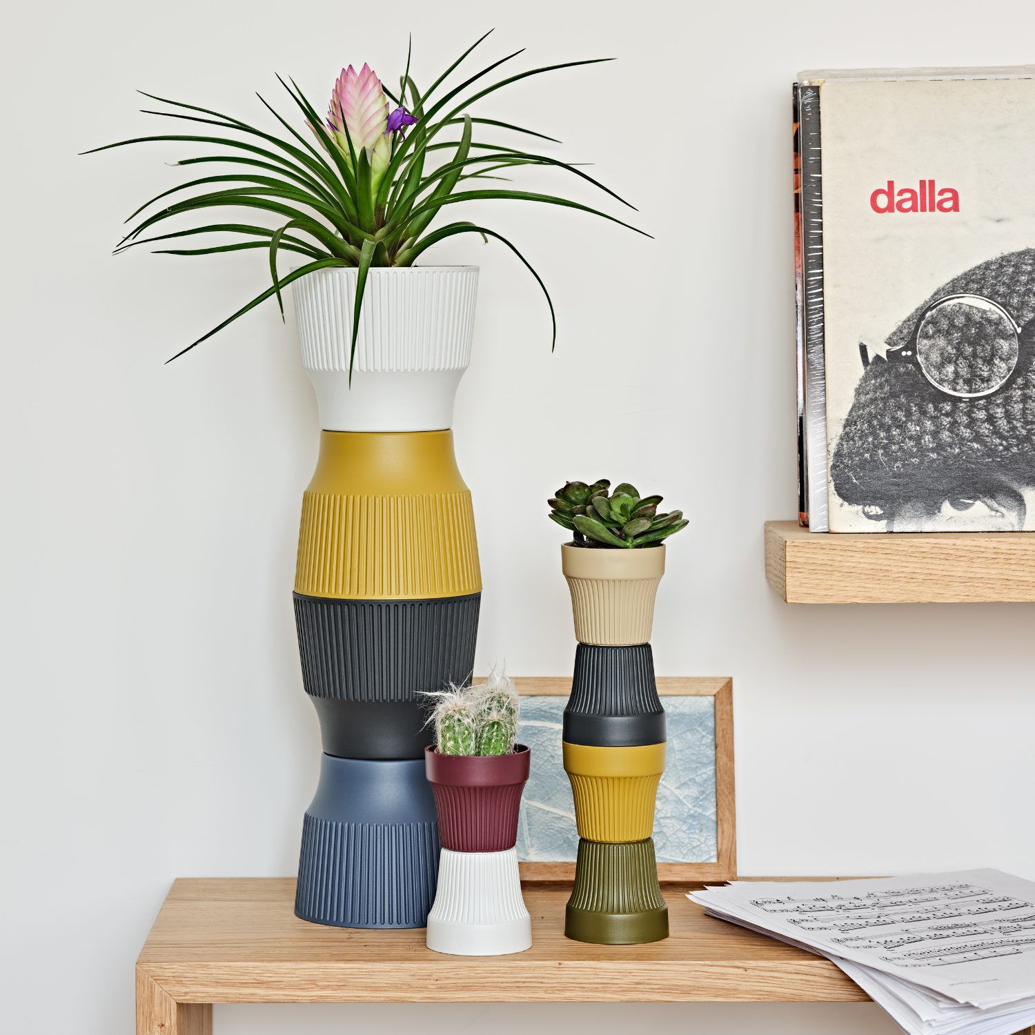 Mini is mainly intended to hold a cultivation pot directly, so plants can be placed inside without repotting. It also pairs well with other cachepots in the collection, such as Tiny and Colorado, for a consistent look.