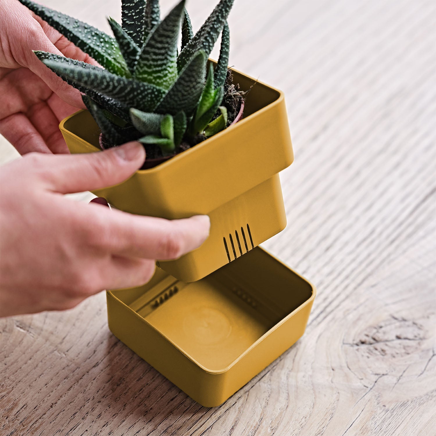 Veleta pot has a saucer that snaps onto the base. Its compact design is ideal for succulents, herbs, and other small plants, especially for indoor use.