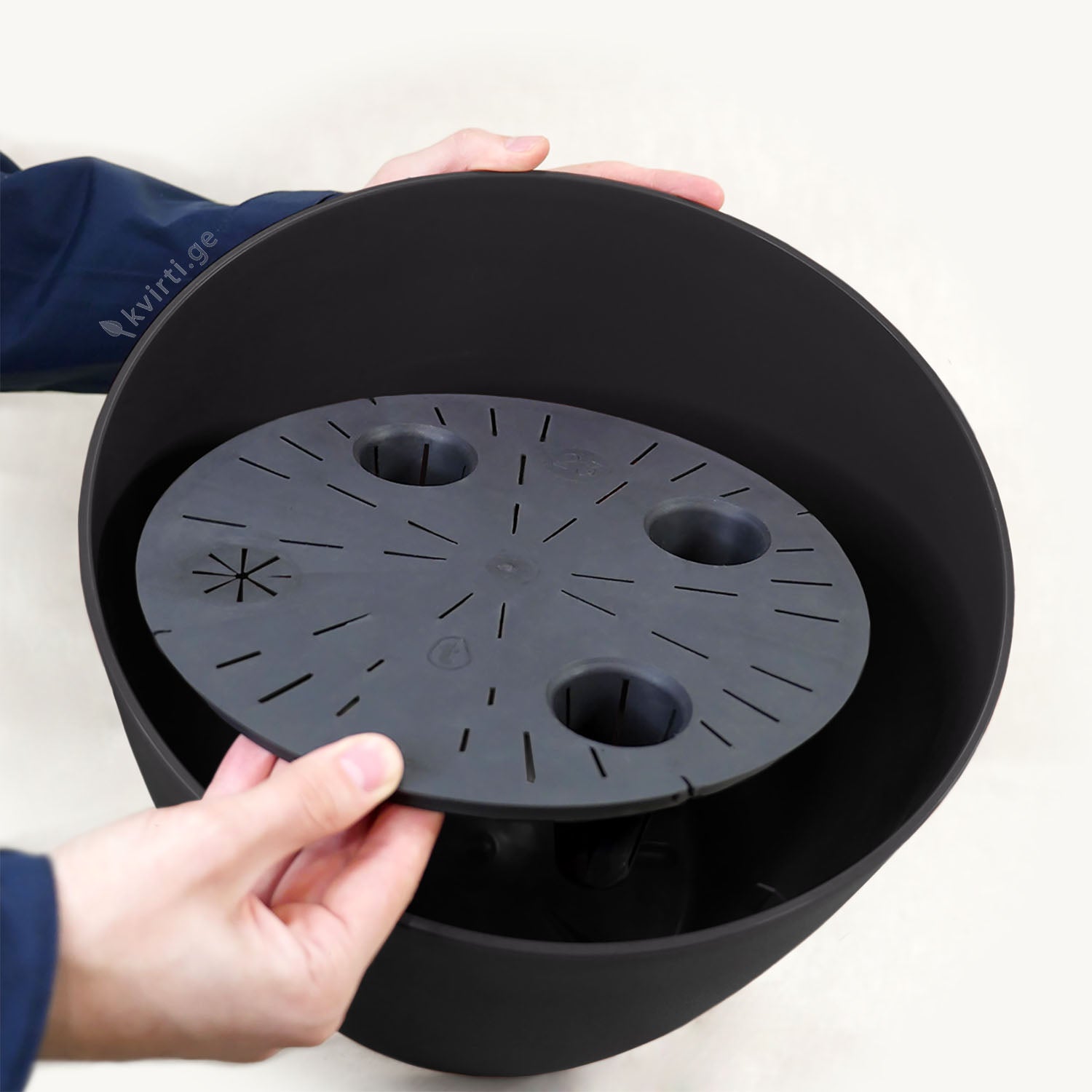 ქოთანი აღჭურვილია ინტეგრირებული წყლის სარეზერვუარო სისტემით მცენარეთა დატენიანების შესანარჩუნებლად, ხოლო ძირში მდებარე ფოთლის ფორმის საცობი საშუალებას გაძლევთ გახსნათ ან დახუროთ სადრენაჟე ხვრელი საჭიროებისამებრ.