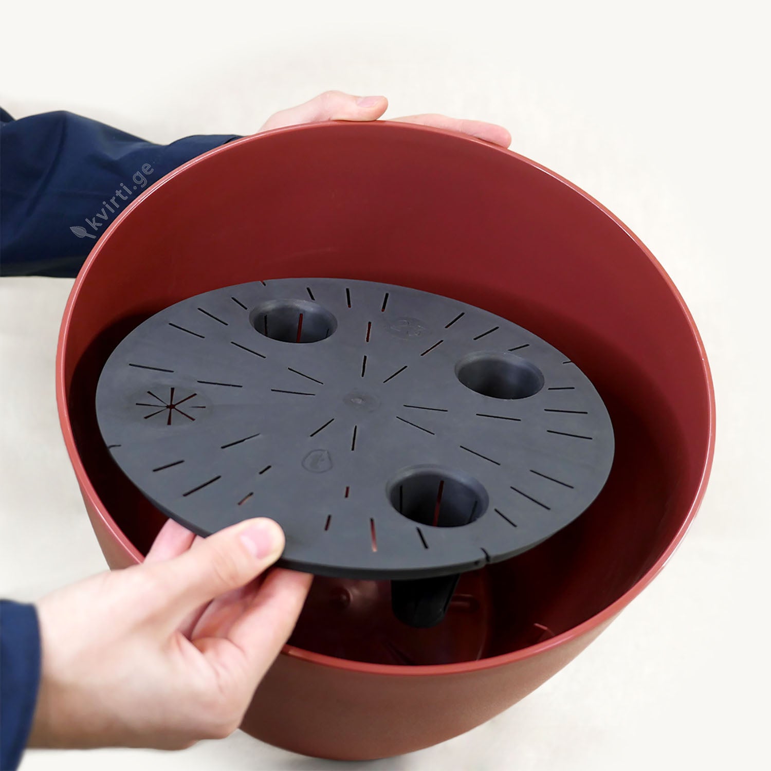 ქოთანი აღჭურვილია ინტეგრირებული წყლის სარეზერვუარო სისტემით მცენარეთა დატენიანების შესანარჩუნებლად, ხოლო ძირში მდებარე ფოთლის ფორმის საცობი საშუალებას გაძლევთ გახსნათ ან დახუროთ სადრენაჟე ხვრელი საჭიროებისამებრ.