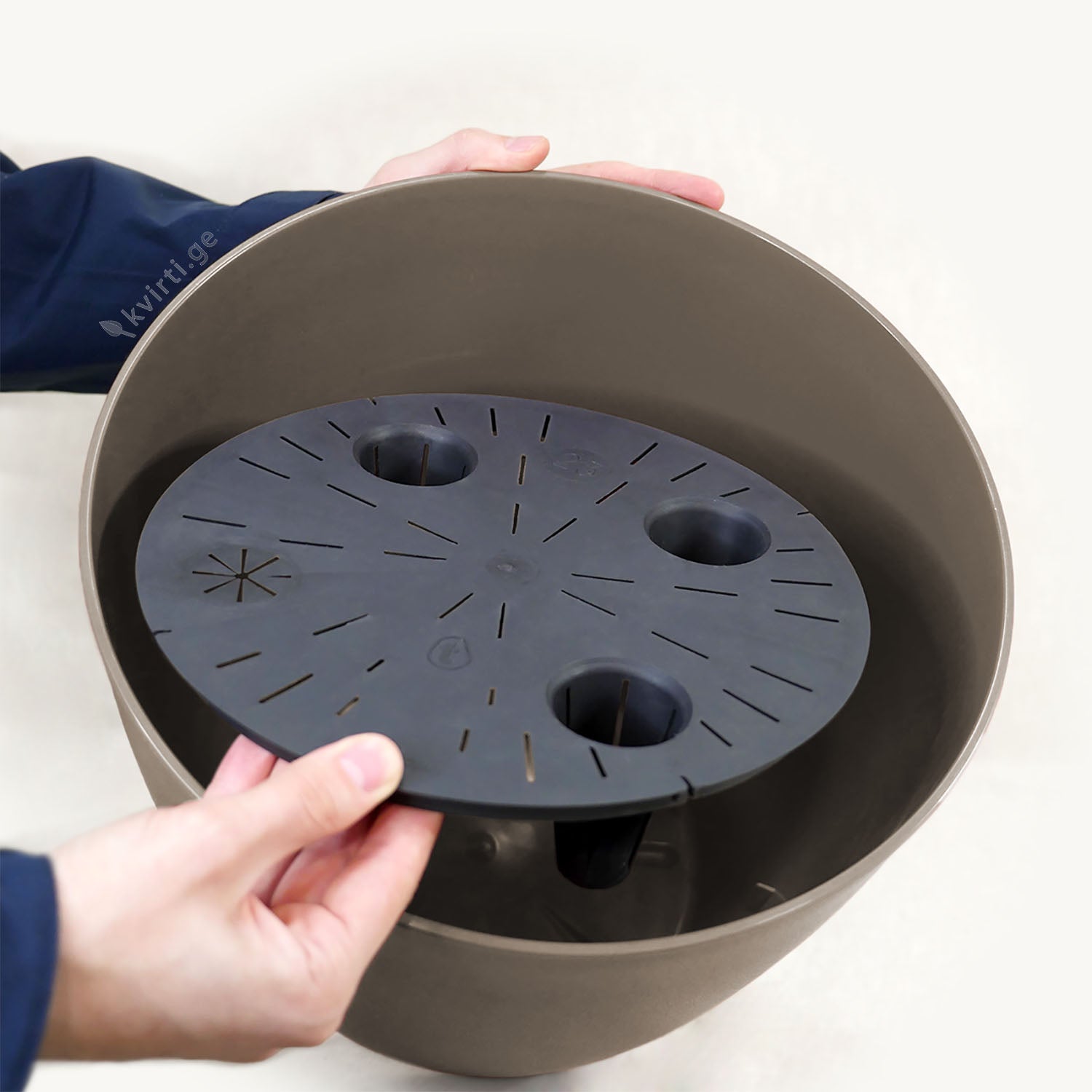 ქოთანი აღჭურვილია ინტეგრირებული წყლის სარეზერვუარო სისტემით მცენარეთა დატენიანების შესანარჩუნებლად, ხოლო ძირში მდებარე ფოთლის ფორმის საცობი საშუალებას გაძლევთ გახსნათ ან დახუროთ სადრენაჟე ხვრელი საჭიროებისამებრ.