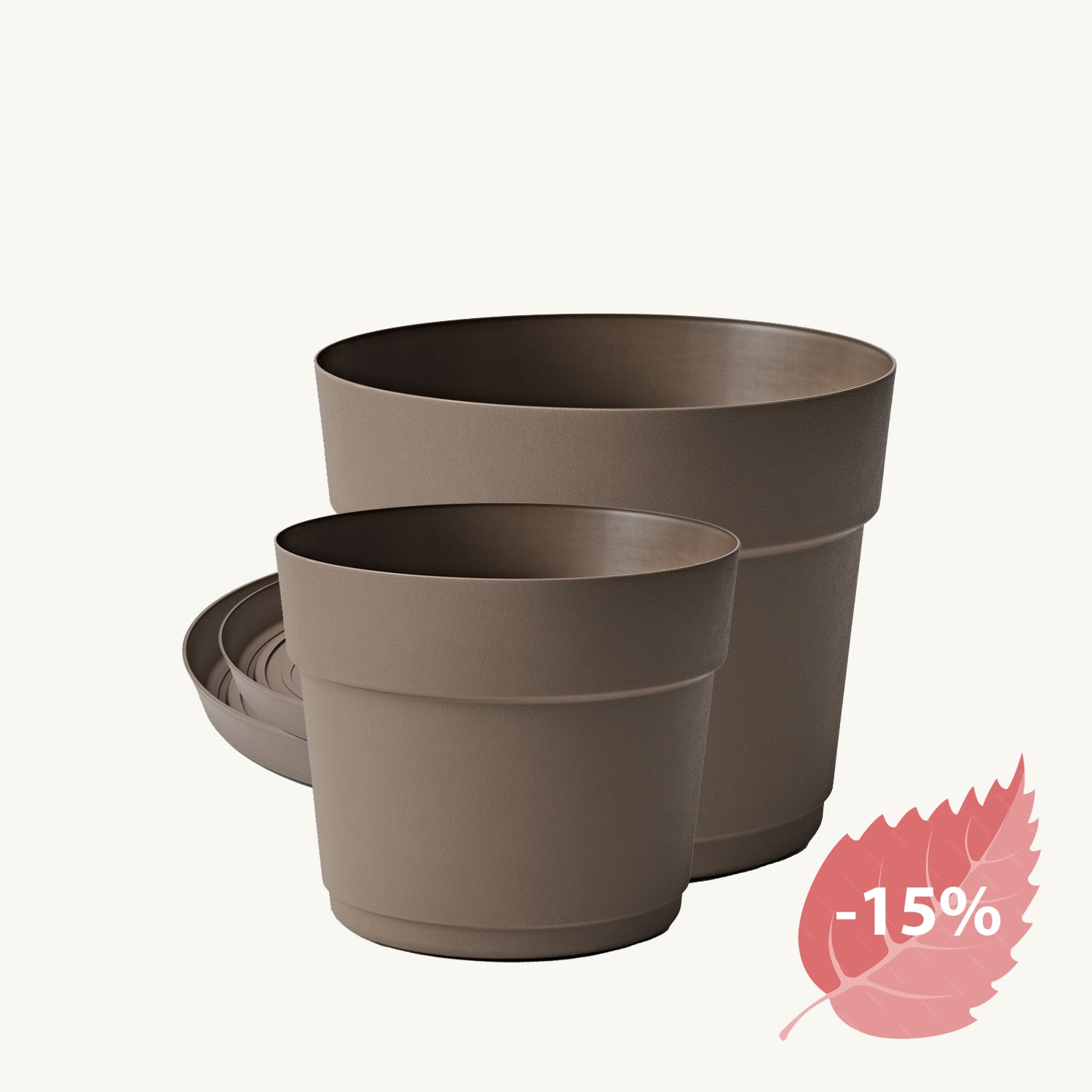 ქოთნების ნაკრები „ბლუმი D2" : ორი სხვადასხვა ზომის - ⌀19 და ⌀24 სმ ქოთანი შესაბამისი თეფშებით, ღია ყავისფერი